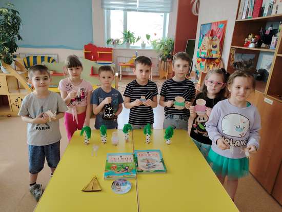 Ребята изготавливают берёзки для декораций.