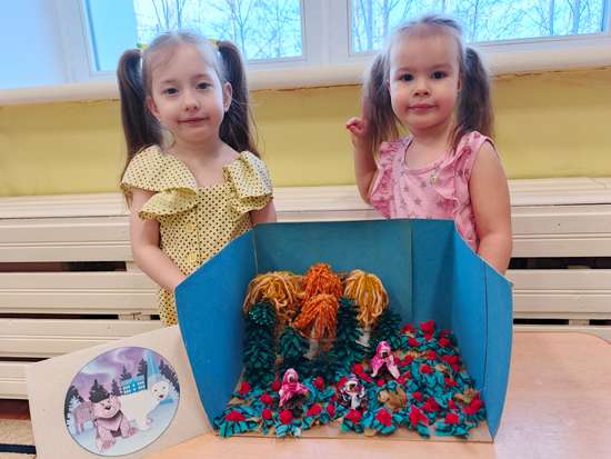 Сбор клюквы—это уникальное сочетание активного отдыха,азартной «охоты» за полезной ягодой и единения с природой.Осенью клюква манит красными «огоньками» на болотах.Это время для прогулок по живописным местам и заготовки богатого витаминами продукта.Сбор клюквы помогает детям узнать больше о природе родного края и полюбить экологически чистые продукты. Сосны:дети красили шишки соединяли их между собой. Березы:дети наматывали нитки для кроны дерева.Педагог соединил нити вместе.С помощью педагога скрутили ствол дерева из ткани и закрепили нитками.Педагог разрезал нитки,чтобы сформировать крону дерева.Дети рисовали на стволе фломастером полоски. Кукла Акань:педагог приготовил основу(замочив верх шишки в воде и скрепив его нитками).Дети скрутили ткань в валик,обернули его на основу и закрепили нитками,одели яркий платок на куклу. Кукла Клюковка:педагог помог сформировать головку при помощи ваты,дети закрепили нитками.Вторую юбку и яркий платок дети формировали и закрепляли. Сборка:педагог сделал фон из бархатной бумаги.Дети закрепили сосны и кукол Акань при помощи пластилина.Педагог закрепил двухсторонний скотч на кукол Клюковок и березы,а дети их размещали на основе.