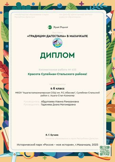 I место на конкурсе Наш орлиный ДагестанУчастник выставки «Традиции Дагестана» в Махачкале