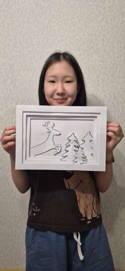 Этот северный олень выполнен из простой бумаги, но он получился почти как настоящий! Я выбрала северного оленя, потому что он добрый, сильный и живёт в волшебном зимнем лесу. С помощью ножниц и скотча плоские листы бумаги превратились в объёмную фигурку. У моего оленя гордо поднята голова и есть большие ветвистые рога. Мне кажется, он вот-вот побежит по снегу.