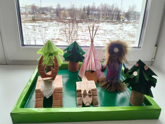 Создание макета «Жизнь в тайге» была инициатива детей,им хотелось не просто сделать макет,но и поиграть с ним. Работа сделана самостоятельно детьми под руководством педагога. Процесс создания макета был очень увлекательный. Пошаговое изготовление поделок ребята взяты из книги "Моя Югра" Ребята использовали картон для изготовления жилища, елей и фигурок животных. Основа составила коробка, оклеенная зелёной бумагой.