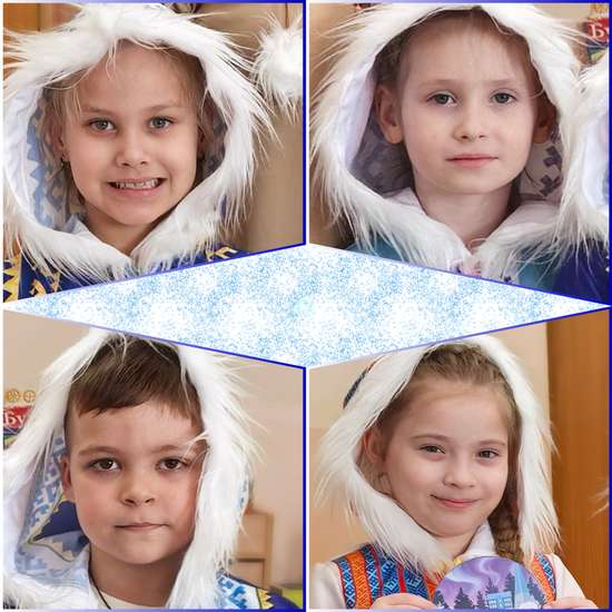 "Зима холодна, но мороз очень жгуч, И ветер бродяга велик и могуч. Здесь птицы красивы, животным тут рай, на радуге света сиянье поймай. А кедры цари, нет им равных нигде, кедровый орех ты отведай в Югре"