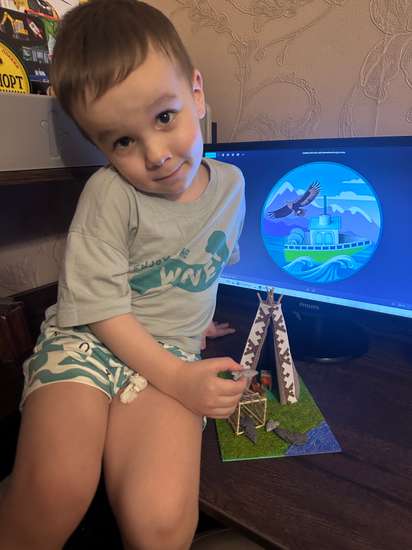 Эта поделка показывает жизнь на Севере через её главные символы: чум, печку, рыбалку и ловушку. Всё здесь подчинено природе — холод, вода и необходимость добывать пищу задают ритм жизни. Печка — источник тепла и уюта, река — кормилец, а чум — дом, где собирается семья. Так мы передали идею номинации «Жизнь в ритме Севера». Эта тема мне интересна, потому что мы живем в ХМАО, а также она учит уважению к природе, труду и простым, но важным вещам. Артур раскрашивал основу, расставлял рыбок, помогал делать печку, дрова и ловушку для ловли рыб (ханты называют ее гимга). Я вырезала и собирала чум, помогала с креплением деталей и оформлением композиции.