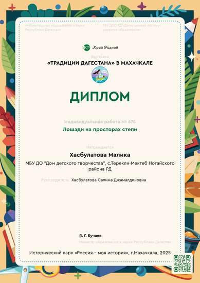 I место на конкурсе Наш орлиный ДагестанУчастник выставки «Традиции Дагестана» в Махачкале