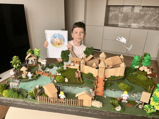 Вдохновением для создания макета послужили проекты "Первое поселение и деревянный Кремль," Боровицкий холм" из курса "Моя Москва, горжусь тобой!". После внеурочных занятий стала интересна история тех мест, по которым гуляем сейчас и ,порой, не задумываемся, чем занимались наши предки, какие постройки их окружали, как разрасталась Москва. Захотелось создать мир прошлого своими руками, оживить его . Перед вами страница ожившей истории-первое поселение на Боровицком холме. В самом сердце композиции возвышается крепость, величественно стоящая на холме, а вокруг неё плавно струится река Москва. У подножия крепости скромные жилища первых поселенцев - землянки. Жизнь древних горожан была тесно связана с природой: промышляли рыболовством, охотились, собирали дары леса. Со временем люди освоили кузнечное дело. Рядом с поселением паслись стада, а окрестные земли возделывались заботливыми руками земледельцев. Взрослые помогали вырезать пеноплекс, работали с эпоксидной смолой, клеевым пистолетом, сверлили стволы деревьев для шпажек. Остальную часть работы участник выполнял сам ,советуясь со взрослыми.
