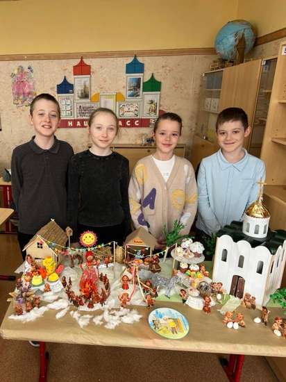 Наша работа отражает путь от широкой Масленицы до светлого праздника Пасхи. В композиции - ароматные блины и соломенное чучело, символизирующие проводы зимы и встречу весны. Рядом — расписные яйца, куличи и веточки вербы, олицетворяющие возрождение, надежду и радость. Вместе эти элементы рассказывают о традициях, единстве семьи и ожидании новых добрых перемен. Наша работа объединяет народные традиции, тепло семейного очага. В нашей работе «Калейдоскоп души русской» представлены: «Масленица» 1. Соломенное чучело и костёр с дровами 2. Дети на бревне 3. Домик с блинами 4. Стол с угощениями и самоваром 5. Дом 6. «Ленточная карусель» 7. «Солнышко-хоровод» 8. Телега с лошадью «Светлый праздник Пасхи» 1. Храм 2. Корзинки с куличами и пасхальными яйцами 3. Корзинка с вербой 4. Сани с лошадью 5. Деревья