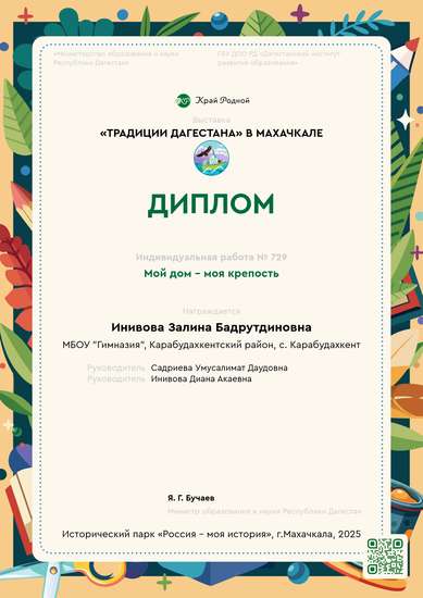 I место на конкурсе Наш орлиный ДагестанУчастник выставки «Традиции Дагестана» в Махачкале