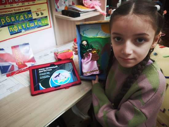 Халикова Малика, ученица 2 "в" класса с радостью приняла участие в конкурсе "Наш орлиный Дагестан" в номинации "Всем людям хватит места на земле". Она изготовила куклу с национальной одеждой народов Дагестана. Малика представила настоящую горянку в платке на фоне гор. Платок олицетворяет скромность и степень воспитания на Кавказе. Будьте прекрасны!