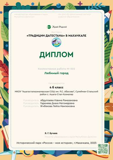 I место на конкурсе Наш орлиный ДагестанУчастник выставки «Традиции Дагестана» в Махачкале