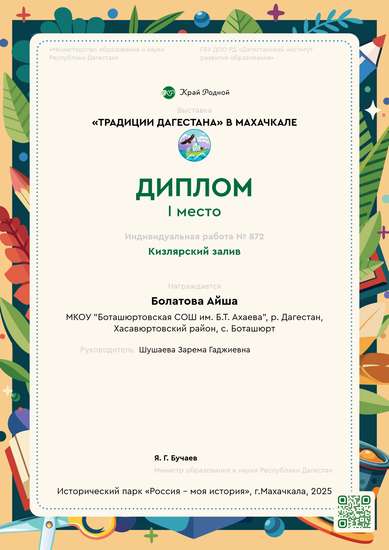 Работа представленная на конкурс описывает красоту одной важнейших точек миграционных остановок и зимовок птиц на западном побережье. Участок "Кизлярский залив" расположен в Тарумовском районе, на северо-востоке Дагестана. На берегу залива обитают животные, занесённые в российскую и республиканскую Красные книги - это кудрявый пеликан, розовый фламинго, малый баклан, орлан-белохвост и другие. В акватории залива создан дагестанский заповедник, занимающий практически всю площадь залива.