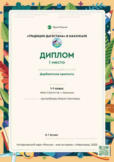 I место на конкурсе Наш орлиный ДагестанI место на выставке «Традиции Дагестана» в Махачкале