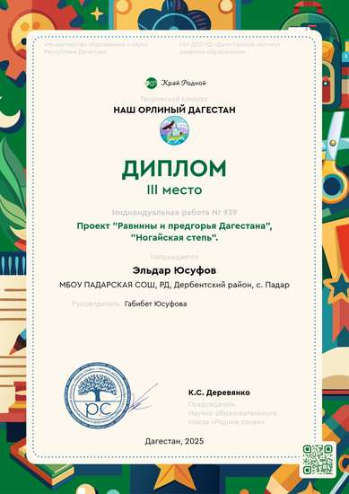 Работу выполнили учительница начальных классов Юсуфова Габибет Рамазановна и сын Юсуфов Эльдар Гайдарович, ученик 1 "б" класса, Падарской средней школы. Наша работа называется "Ногайская степь", "Юрты Ногайцев". Очень понравилось работать над этим проектом и участвовать в конкурсе. Спасибо организаторам конкурса, участникам желаю удачи. Все работы прекрасны. Дагестан мой край любимый, будем изучать историю своей родины, своего края, ценить красоту.